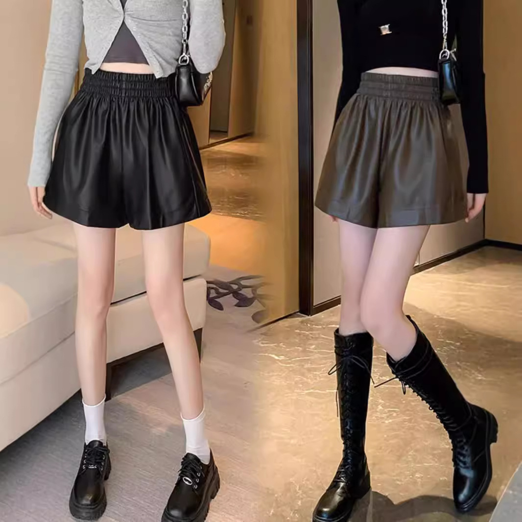 大きいサイズの婦人服の2024秋冬の新型の高腰のナシ型の体つきのa字のショートパンツはやせている広足のPUの短い皮のズボンのブーツのズボンを現します。