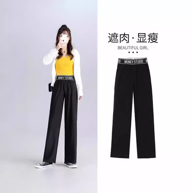 氷の糸のまっすぐな筒のスーツのズボンの女性の2024の新型の潮の春秋の高い腰のカジュアルなペンダント感の黒色のゆったりしている広腿のズボン