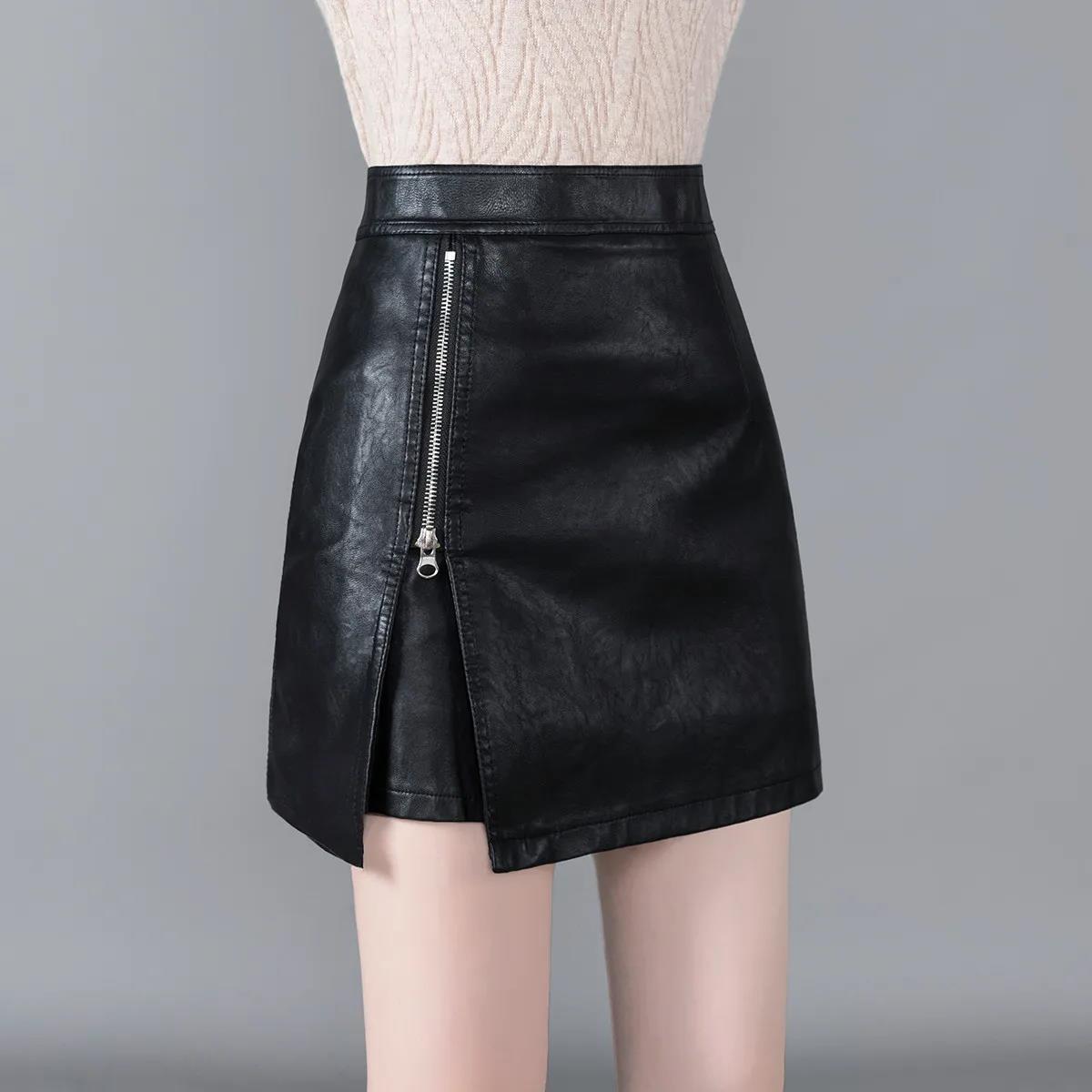 秋冬の新型韓国版の小さい皮のスカートはフォークの半身のスカートの女性のセクシーな黒色のスカートの高い腰の短いスカートの学生のa字のスカートを開きます。