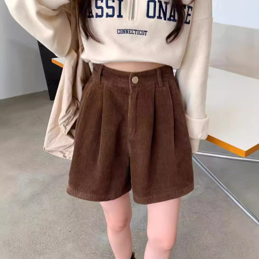 コーデュロイショートパンツレディース2024新作秋コーヒー色ハイウエストa字ワイドレギンスカジュアル小柄5分丈パンツ