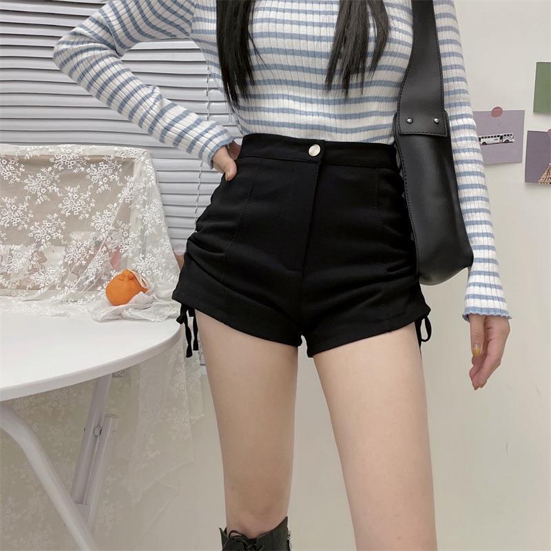黒い半ズボンの女性の夏の2024の新型の大きいサイズの太っているmmの広足のズボンの高腰の百合はやせている縄のカジュアルなホットパンツを現します。