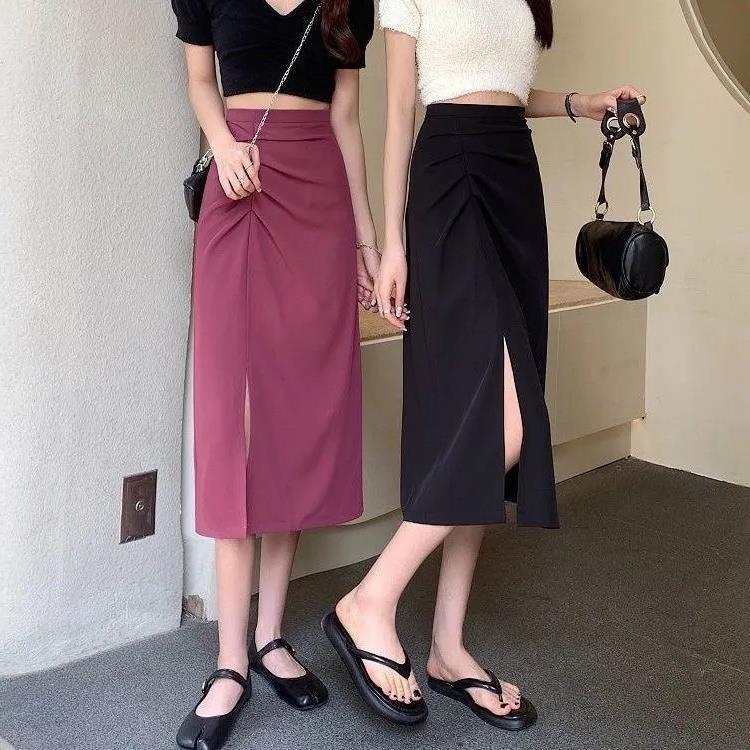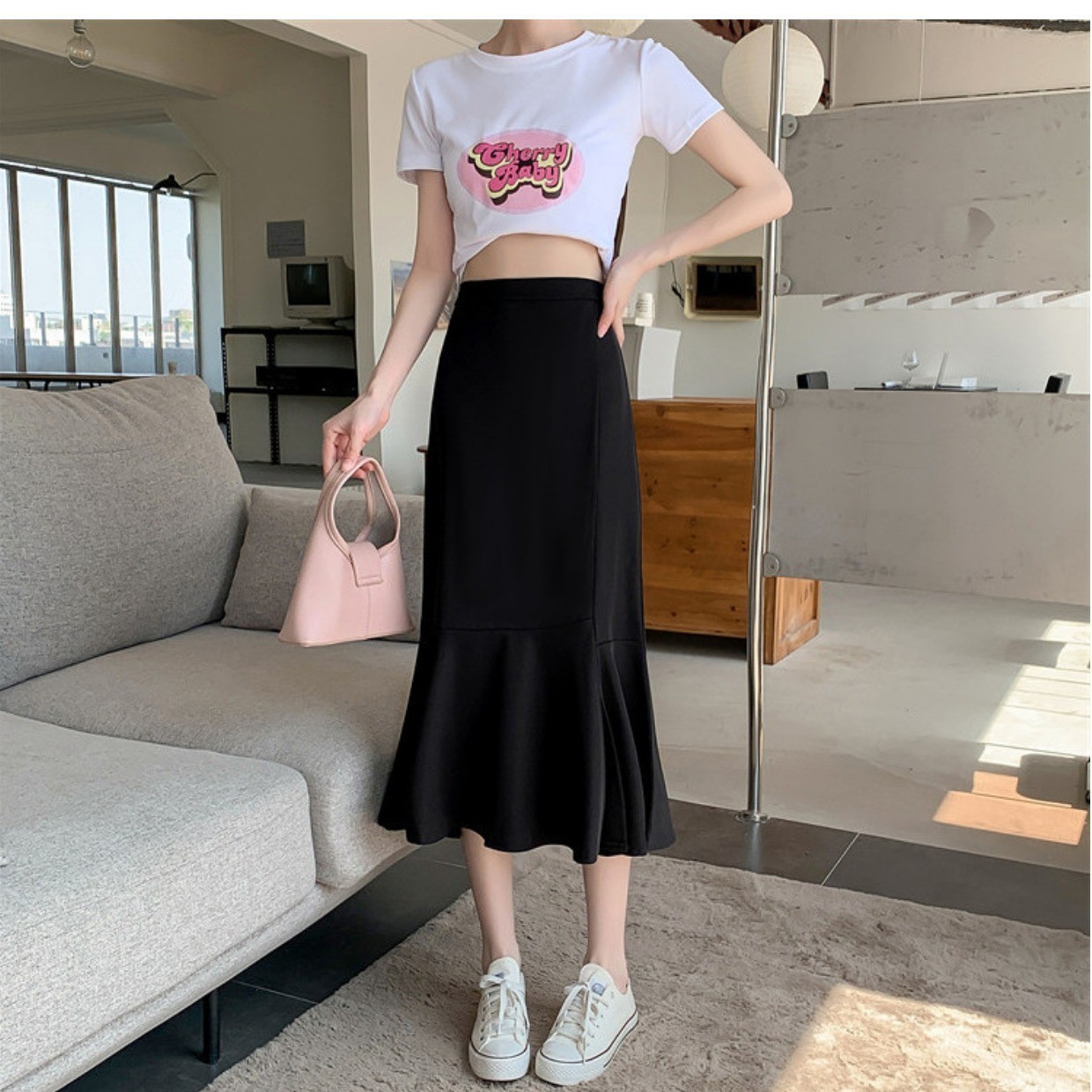黒い氷の糸の半身のスカートの女性の夏の2024の新型の韓国版はやせている中の長いタイプの高腰のa字の魚の尾のスカートのロングスカートを現します。