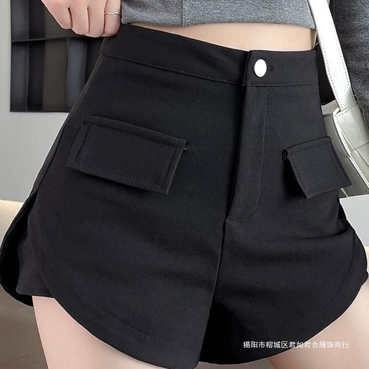 ダブルポケットの黒いカジュアルなショートパンツの女性の夏の2024年の新型の韓国版の純色はやせています。