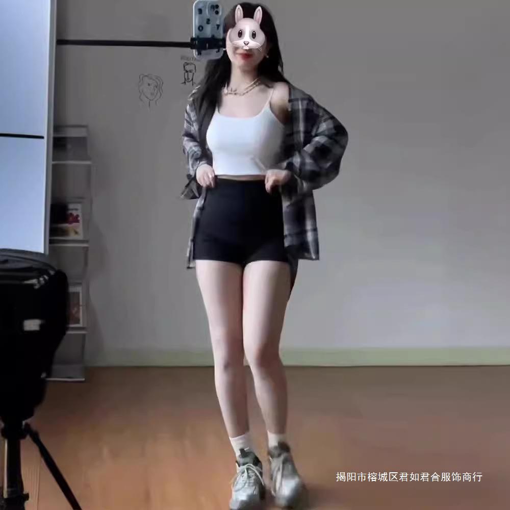 黒い腰の高いギャルの外には、スリムなショートパンツを着ています。
