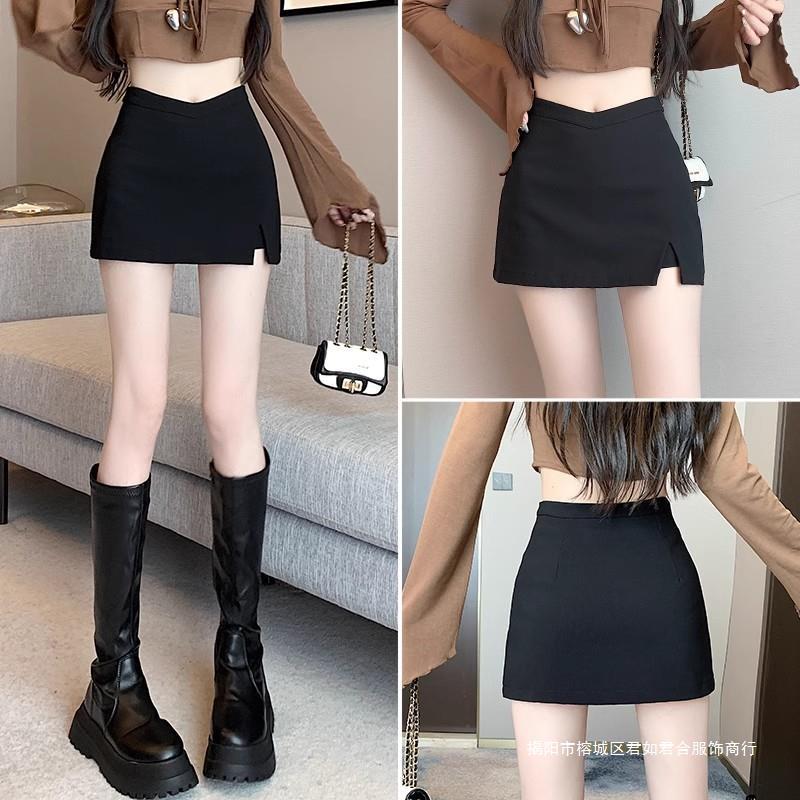 黒の不規則なオープンフォーク高腰スカート2024夏の新型の中長タイプのa字スカート