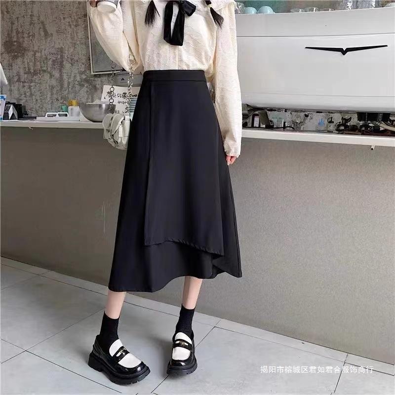 黒い半身のスカートの女性の春秋の中の長いタイプのa字のスカートの女性の大きいサイズの太ったmmのカジュアルな高腰の不規則な傘のスカート