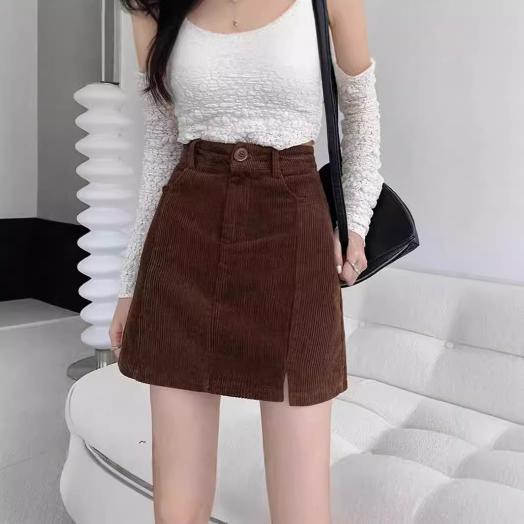 コーデュロイのスカートのファッションのスカートの女性の秋冬の2024の新型の小さい背のa字のスカートの高腰はやせているヒップのスカートを現します。