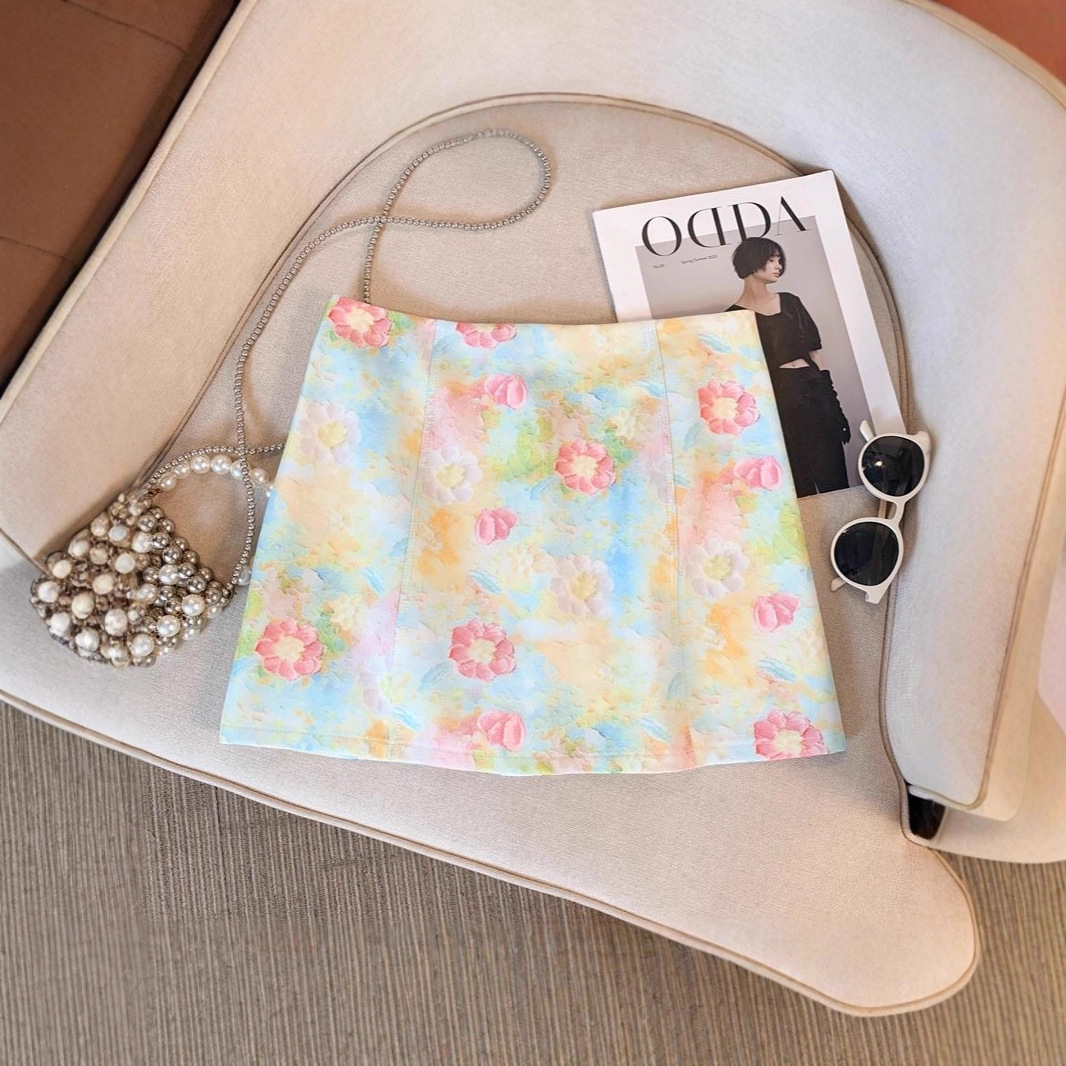 女性用花柄スカート、甘いホリデースタイル、夏のハイウエストスリムAラインスカート、油絵スカート、ヒップカバースカート、万能ショートスカート
