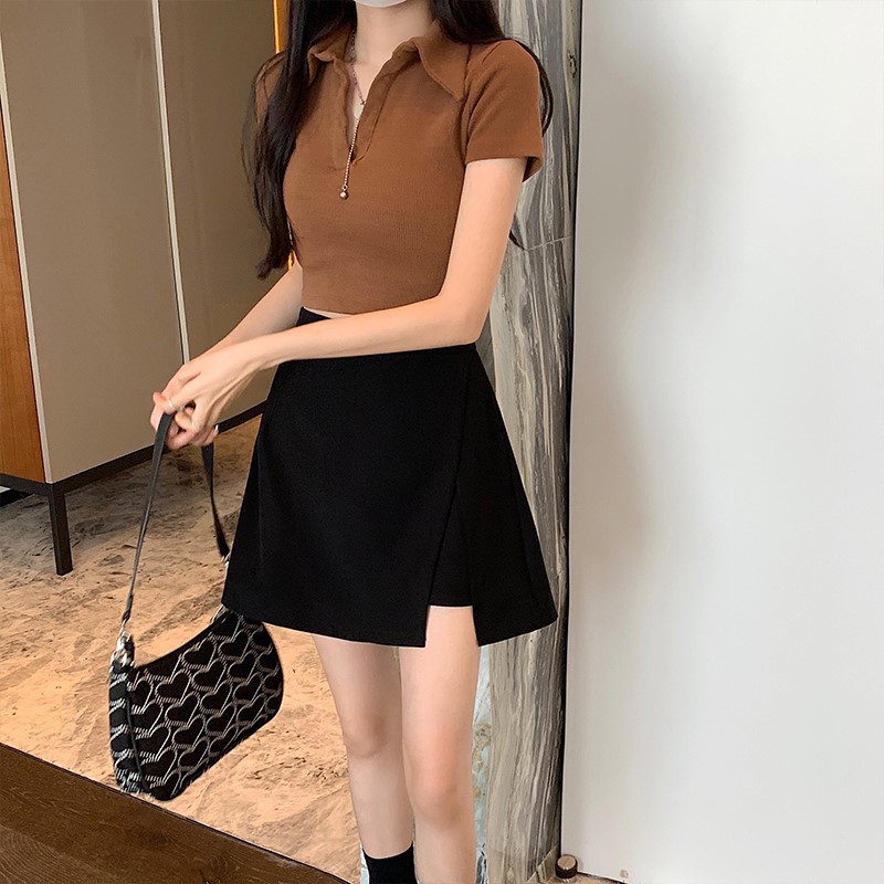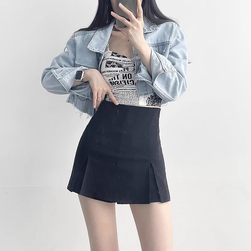 大きいサイズの黒い高腰のオープンスカートの女性のギャルの2023新型の韓国版のデザイン感はお尻のA字のスカートの潮を包みます。