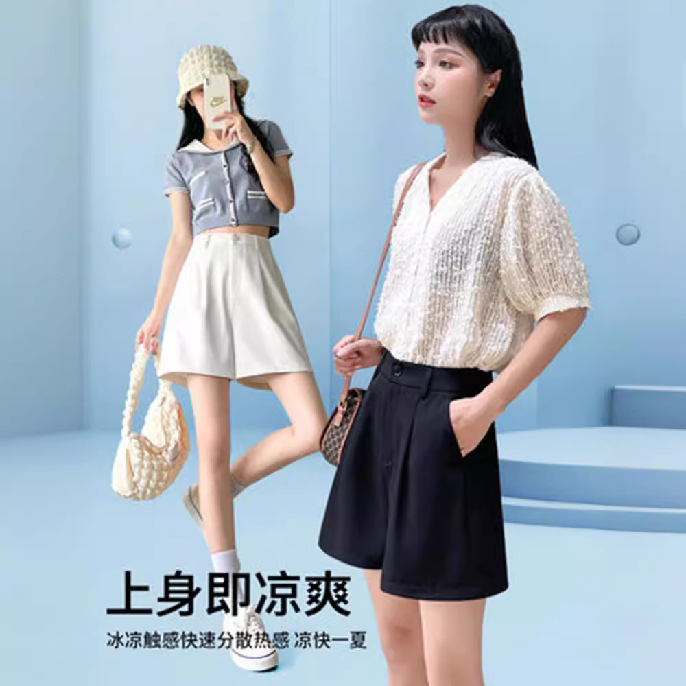 垂れ下がった感じの広い足のスーツのズボンの夏の韓国版の2024の新型の外は腰が高くてやせている黒色のA字のカジュアルな半ズボンの女性を現します。