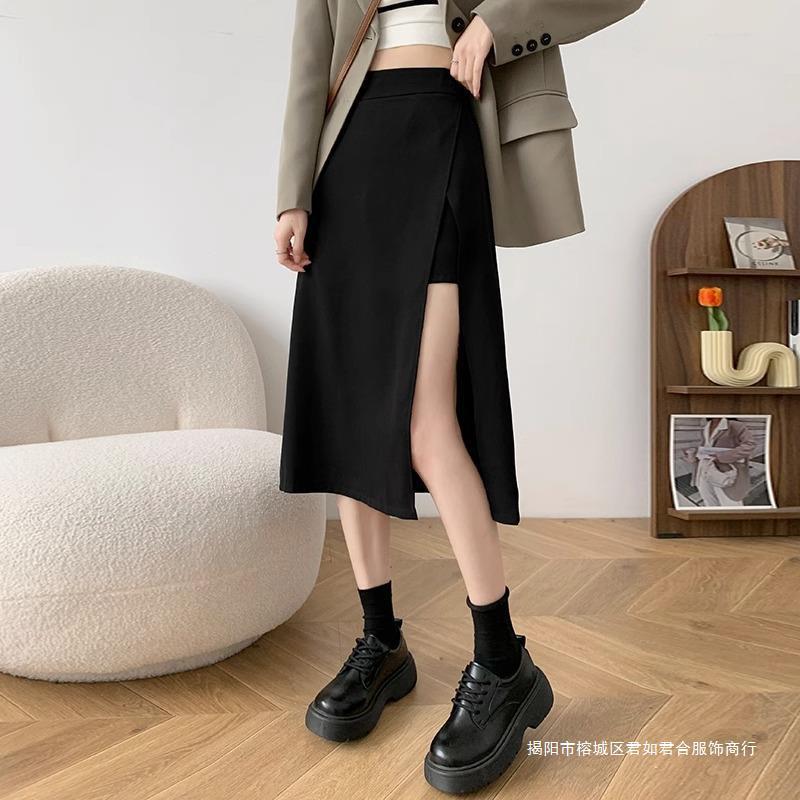 2024夏の新型の大きいサイズの太ったmmの高い腰の中の長いタイプの黒色のオープンフォークの半身のスカートの女性はやせているa字のヒップのスカートを現します。