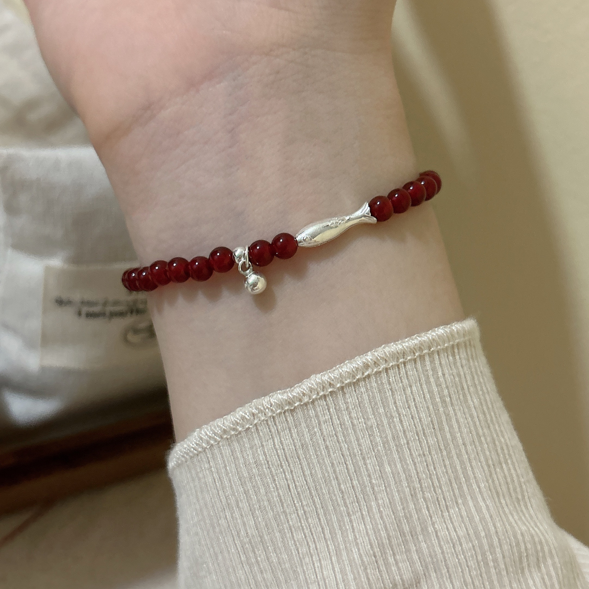 本格的なS925純銀新中国式紅瑪瑙錦鯉銀珠弾力縄ブレスレットはシンプルで百合シングルです。