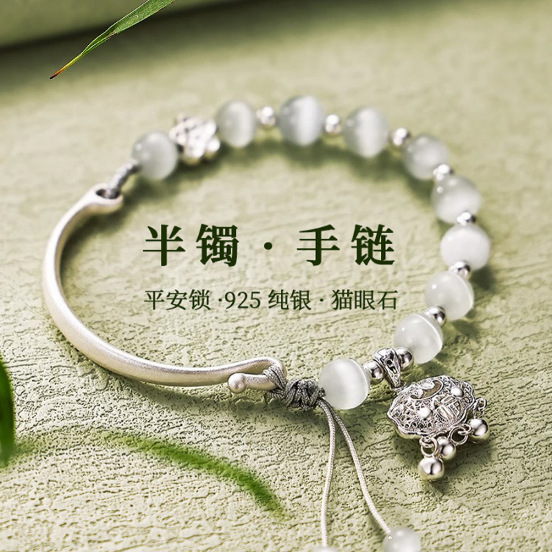 正統S925純銀平安錠猫眼石ブレスレット女子学生半腕輪半鎖軽豪華小衆精致ブレスレットビーズ