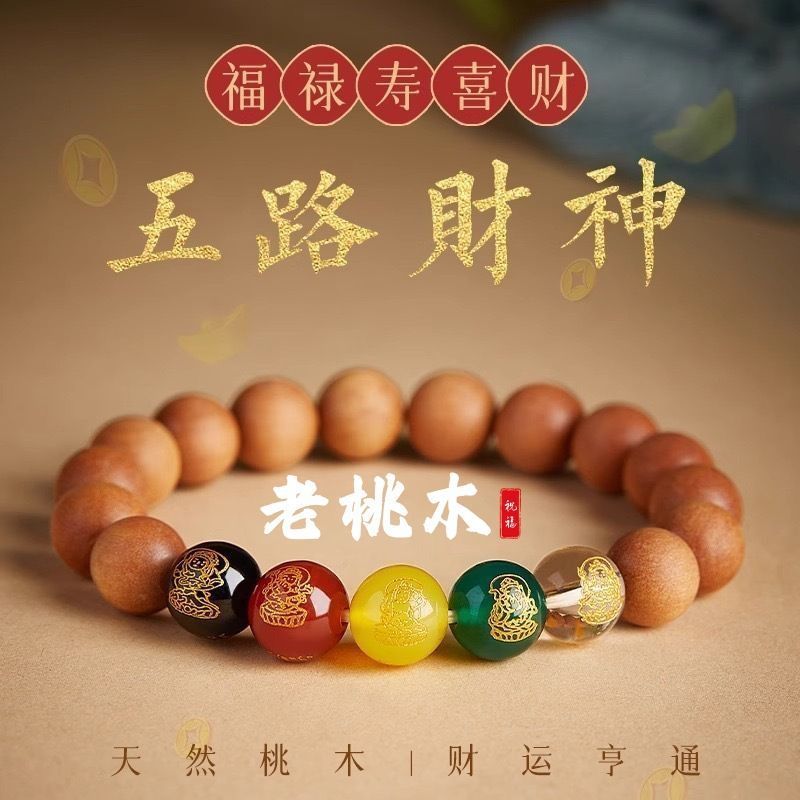 正統五路財神桃木手串新商品レトロ天然文プレイ高品質桃木ブレスレットアクセサリー招財手