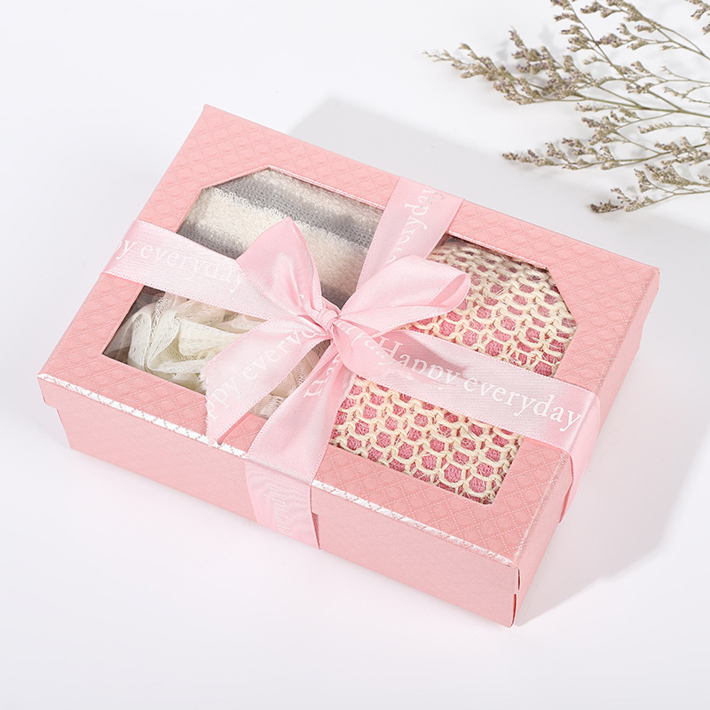 ピンクのギフトボックスの祝日セットのバスタオルの手袋のお風呂のお風呂のお風呂のセットのリネンのストライプの手袋のギフトボックスの3つのセット