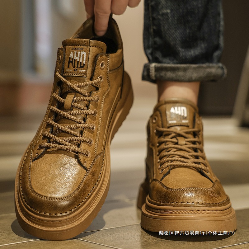 春の男の靴2025の新型の英倫の本革のカジュアルな中で靴の男性の百合の厚い底の板の靴の工装のショートブーツを手伝います。