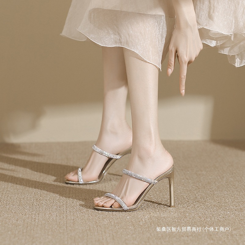 2025 夏の新シルバーワンストラップサンダルハイヒール女性のスティレットヒールスリッパラインストーンゴールデンハーフスリッパアウターウェア