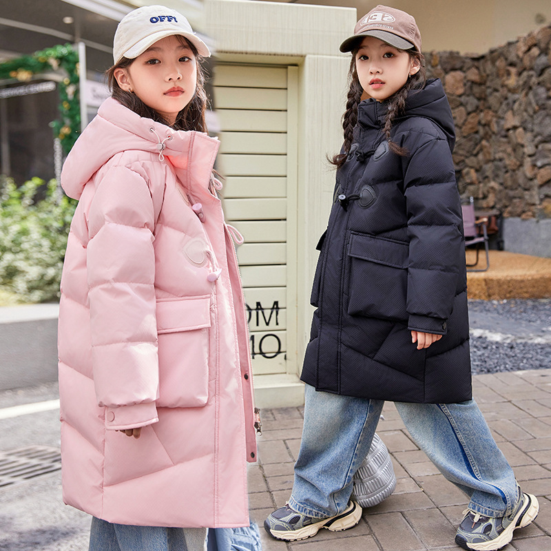 女の子のダウンジャケットの中の長いタイプの新型の帽子の中の大きい子供の2024冬は女の子の保温のコートの白いアヒルの毛を厚くします。