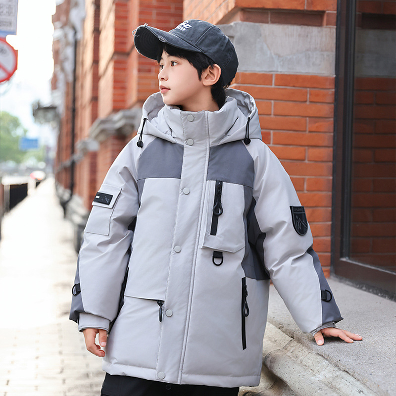 冬の新型男の子のダウンジャケットの中の大きい子供の白鴨の絨毯は帽子の男の子の短いタイプのカジュアルな洋風がコートの潮を洗うことを免除します。