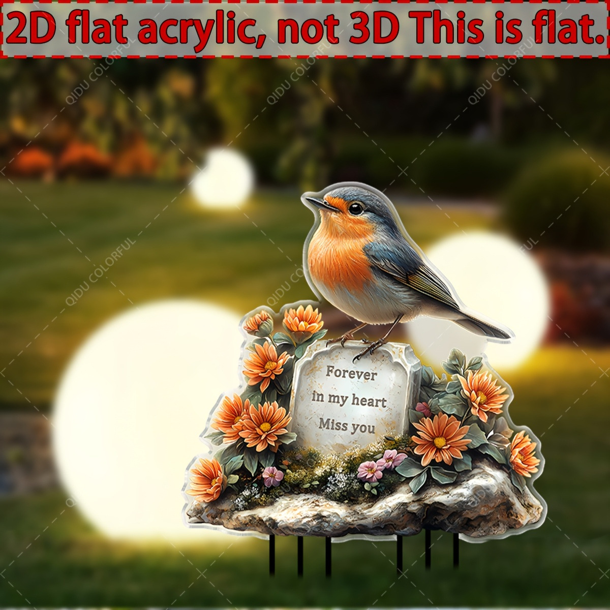 2D フラット レトロ アクリル記念庭園インサート - 赤い鳥と花柄、「私の心の中に」付き