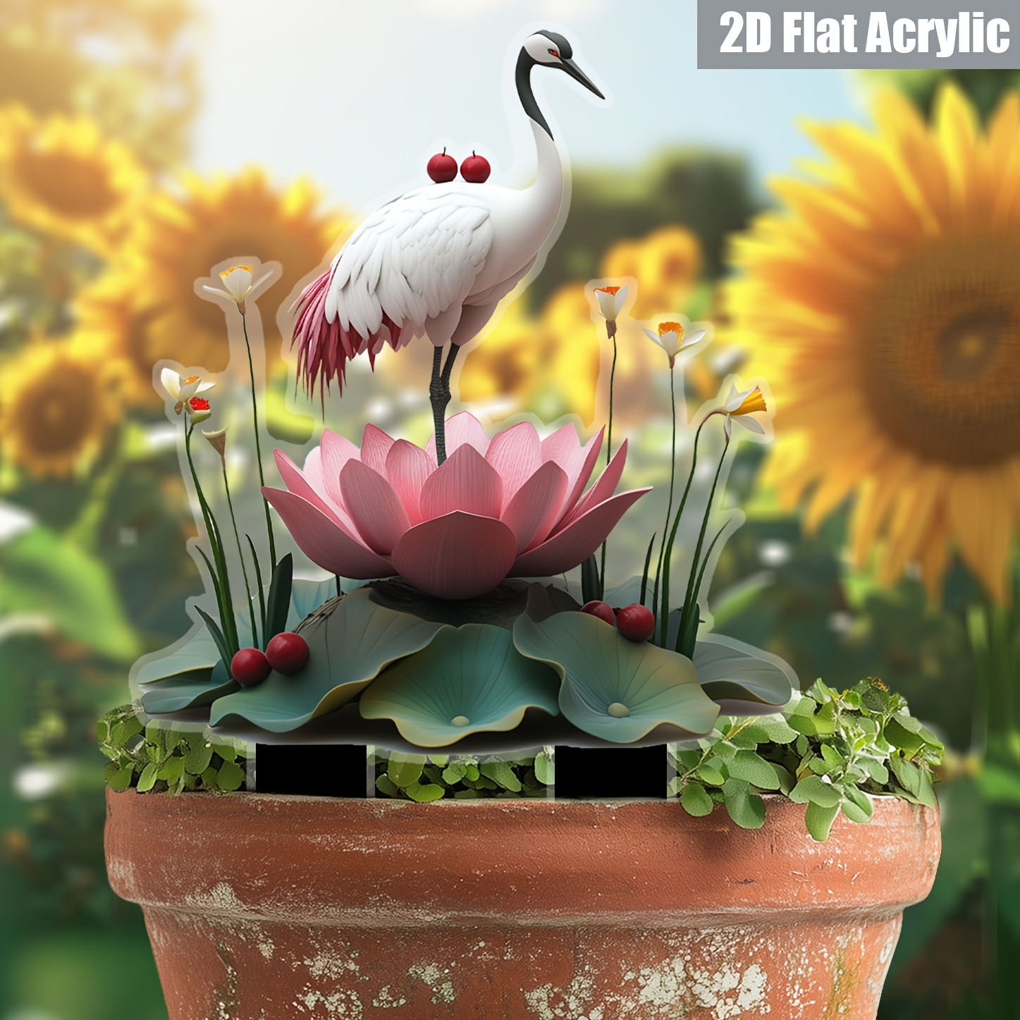 ヴィンテージスタイルの屋外装飾、2D プレーンアクリルロータスハンギングバスケット、赤い果実とひまわり付き - NO