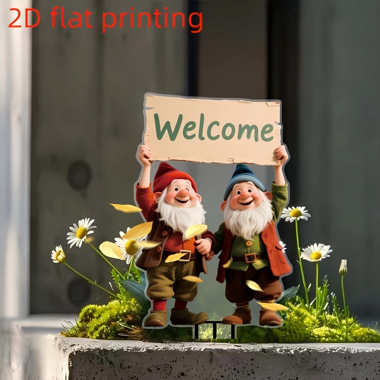 2D平面アクリル。 歓迎サインを持った2人のかわいいノームの庭のアクリル製インサート