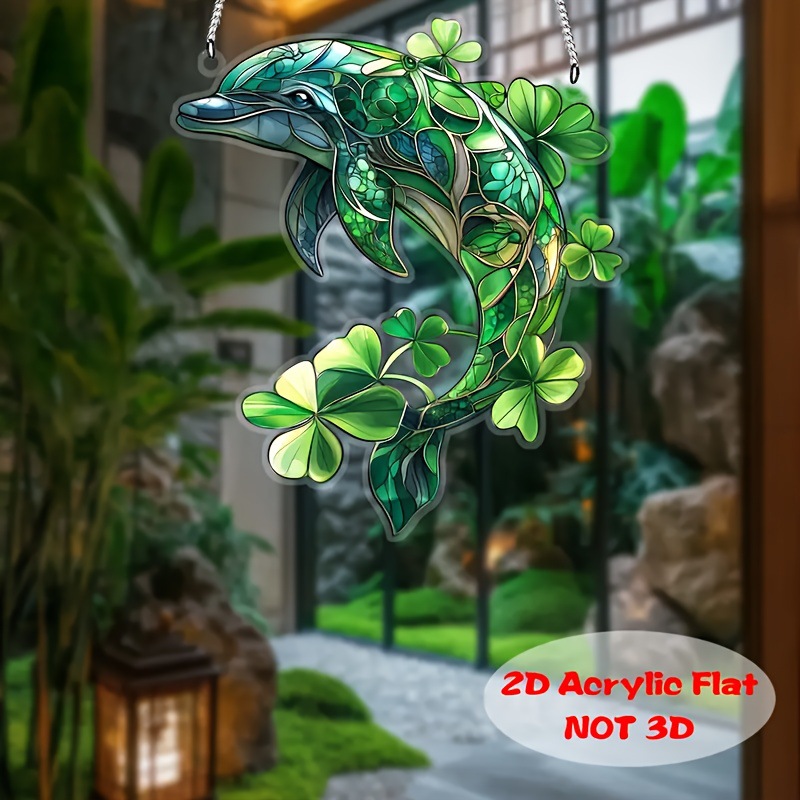 1 個の 2D クリスタルイルカ壁掛け装飾、聖パトリックの日のテーマ、四つ葉のクローバーのデザイン、8x6。