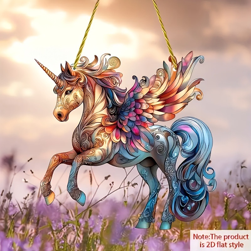 1 個 2D アクリル - ユニコーン壁掛け、フレームレス装飾アート | マルチカラーの花と羽のデザイン