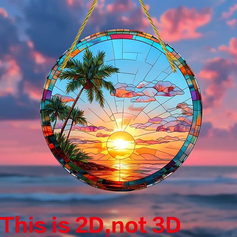 2D フラット、1 個 2D アクリル ハワイの夕日吊り下げ装飾 - 8x8inch トロピカル ビーチ風景とブラウン