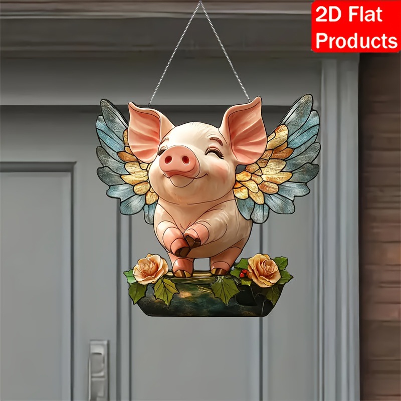 1 個ボヘミアンスタイル 2D フラットアクリル豚吊り下げ装飾品羽と花柄 - 鮮やかな色