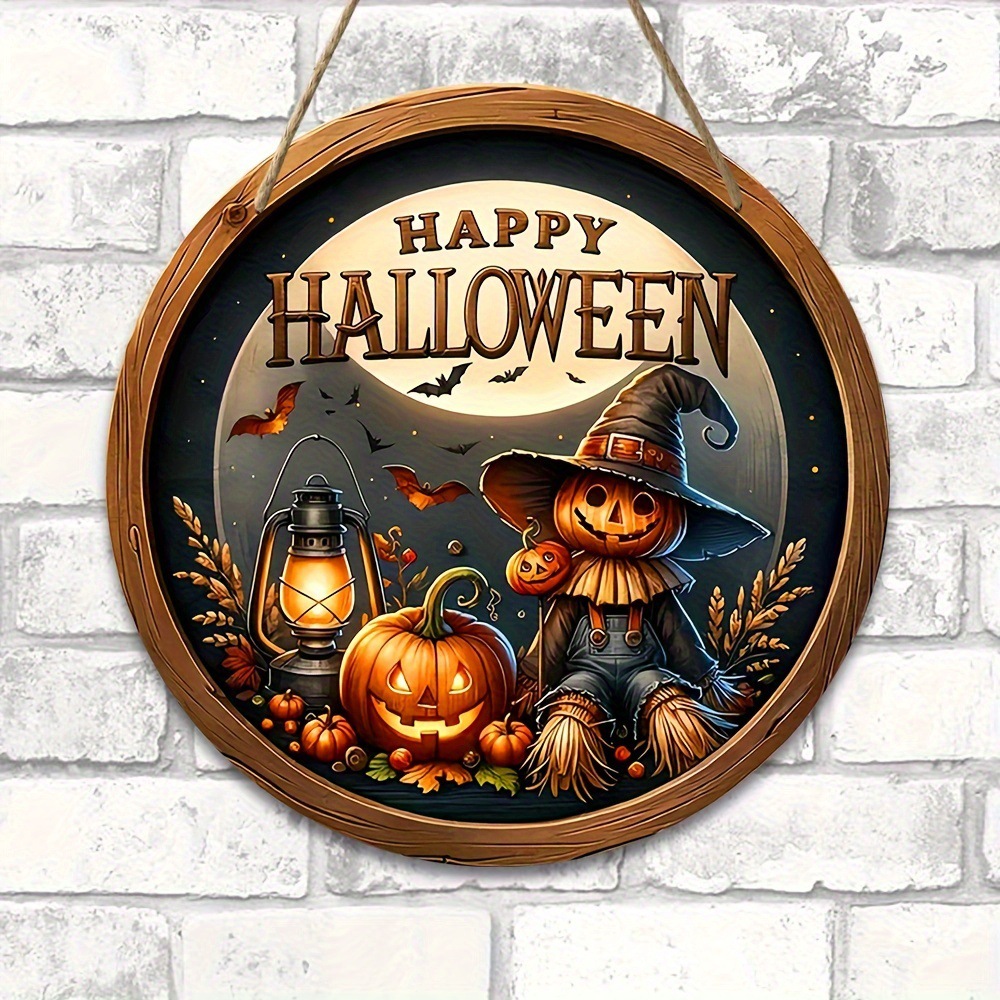 ハロウィン ストローマン パンプキン付き ラウンド木製タグ - 7.9インチ x 7.9インチ ドア、壁、家、ドア用
