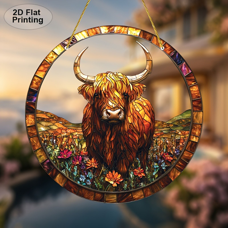 1つ、高地牛日光捕獲器、9 "x 9" アクリル壁掛け、田舎農舎動物装飾、2d