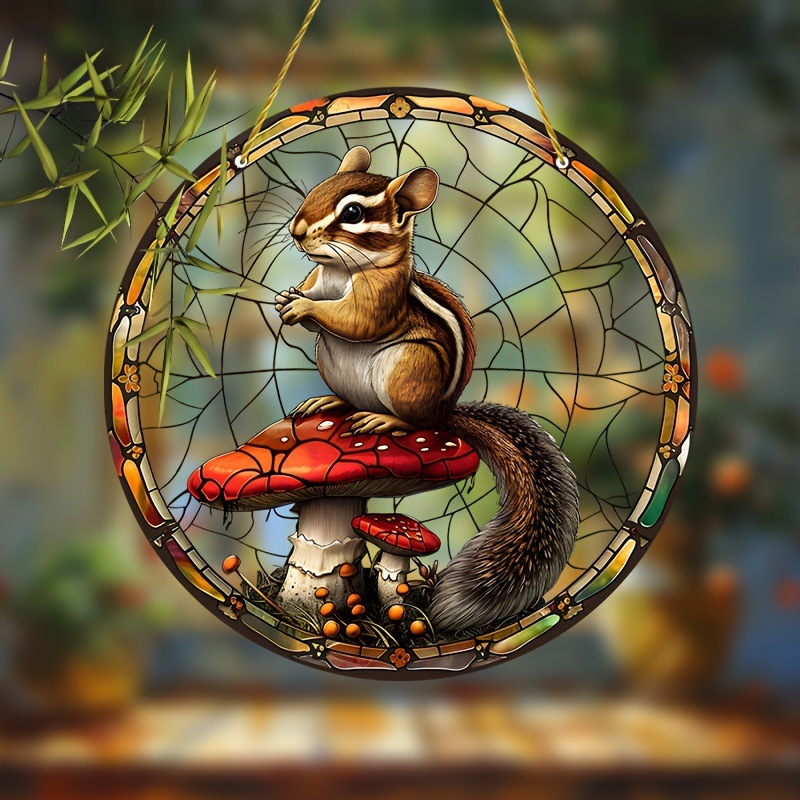 リスとキノコの庭の日光捕獲器、9x9インチ2Dフラットアクリル、動物のテーマ窓