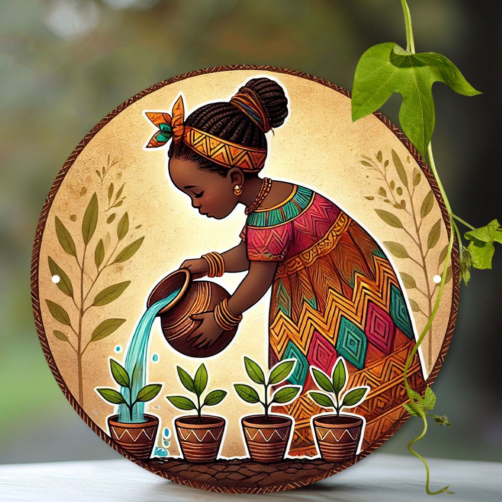 魅力的な7.8インチ円形アルミ看板「女の子が新緑を注ぐ」デザインは、家庭や
