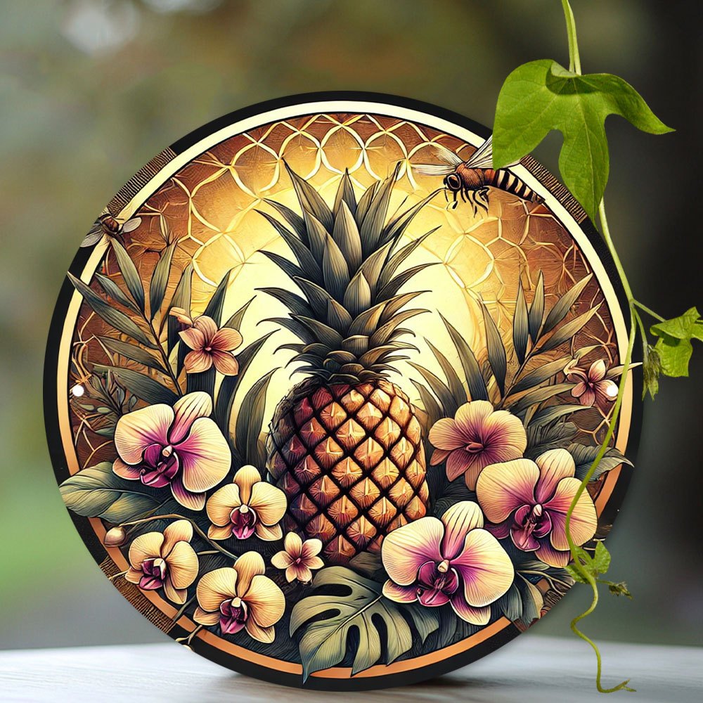 1ピーストロピカルパイナップル花アート-7.8インチラウンドアルミ金属ロゴ、hd印刷、アンチ