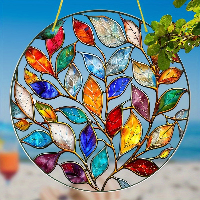 活気に満ちたカラーガラス葉アクリル捕夢網-円形窓吊り下げロープ付き、カラー