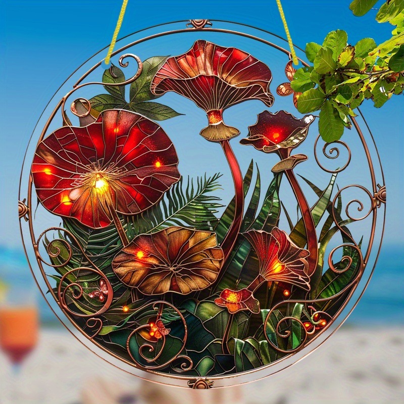 レトロなアクリルの夢の網の標識-野生のキノコと花卉のカラーガラスの窓の装飾、円形の装飾