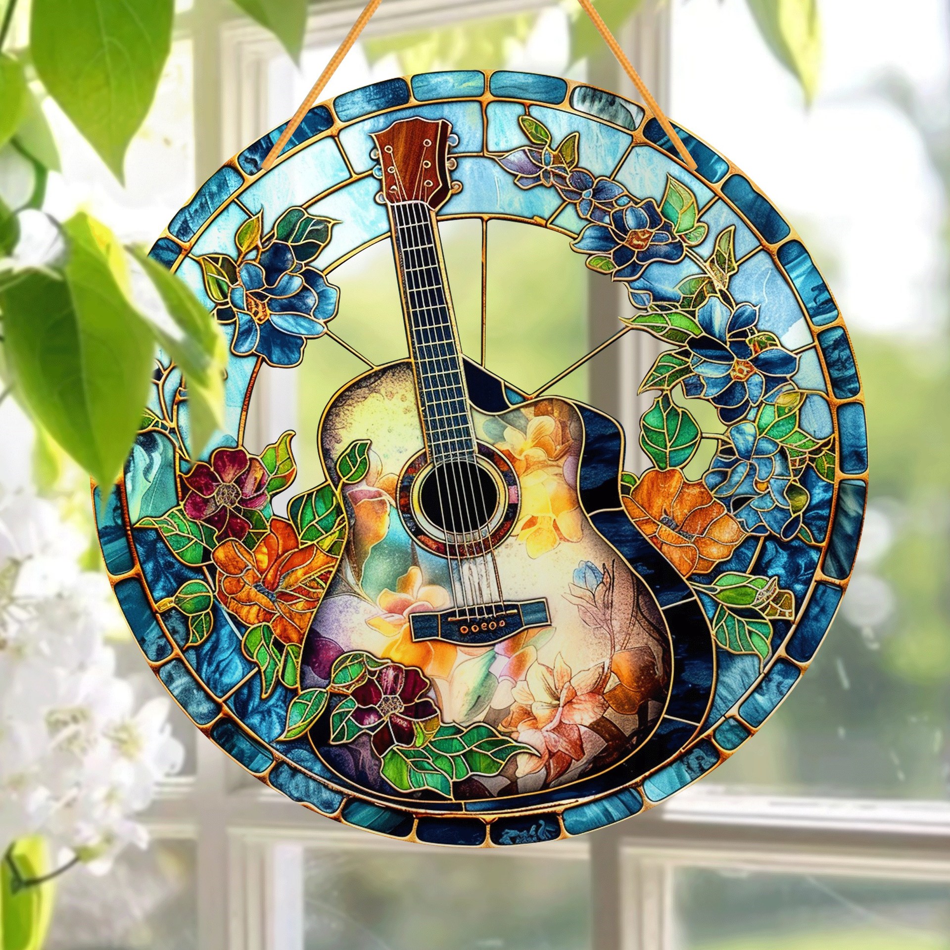 クリスタルギターステンドグラスガーデン日焼けキャッチ吊り下げ8x8インチ-屋内、ポーチ、庭