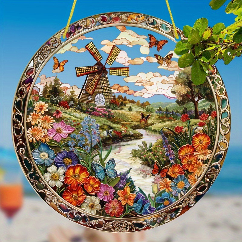 レトロな風車農場の夢網-アクリルカラーガラス円形壁芸術、7.87インチ