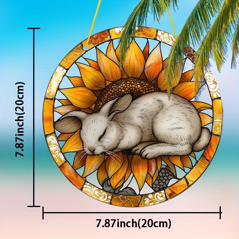 1点のアクリルは夢のネットの壁の芸術を捕ります。ひまわりの上で眠るウサギ、ステンドグラスのスタイルは丸いです。