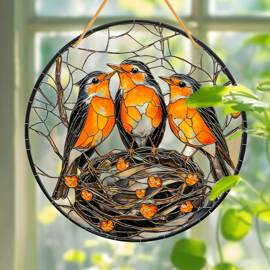 1つのクリスマスの鳥の巣の日光のキャッチャー、8 "x 8" アクリルのステンドグラスのスタイル、動物のテーマは掛けます。