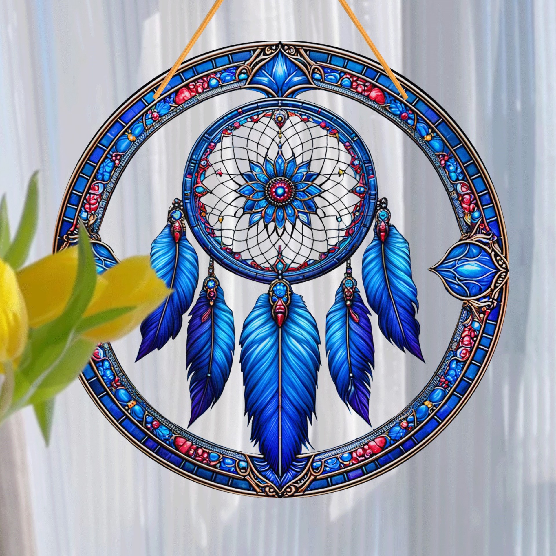 夢の捕獲者、アクリルの看板、羽のついたリス、カラーガラスの窓がぶら下がっている