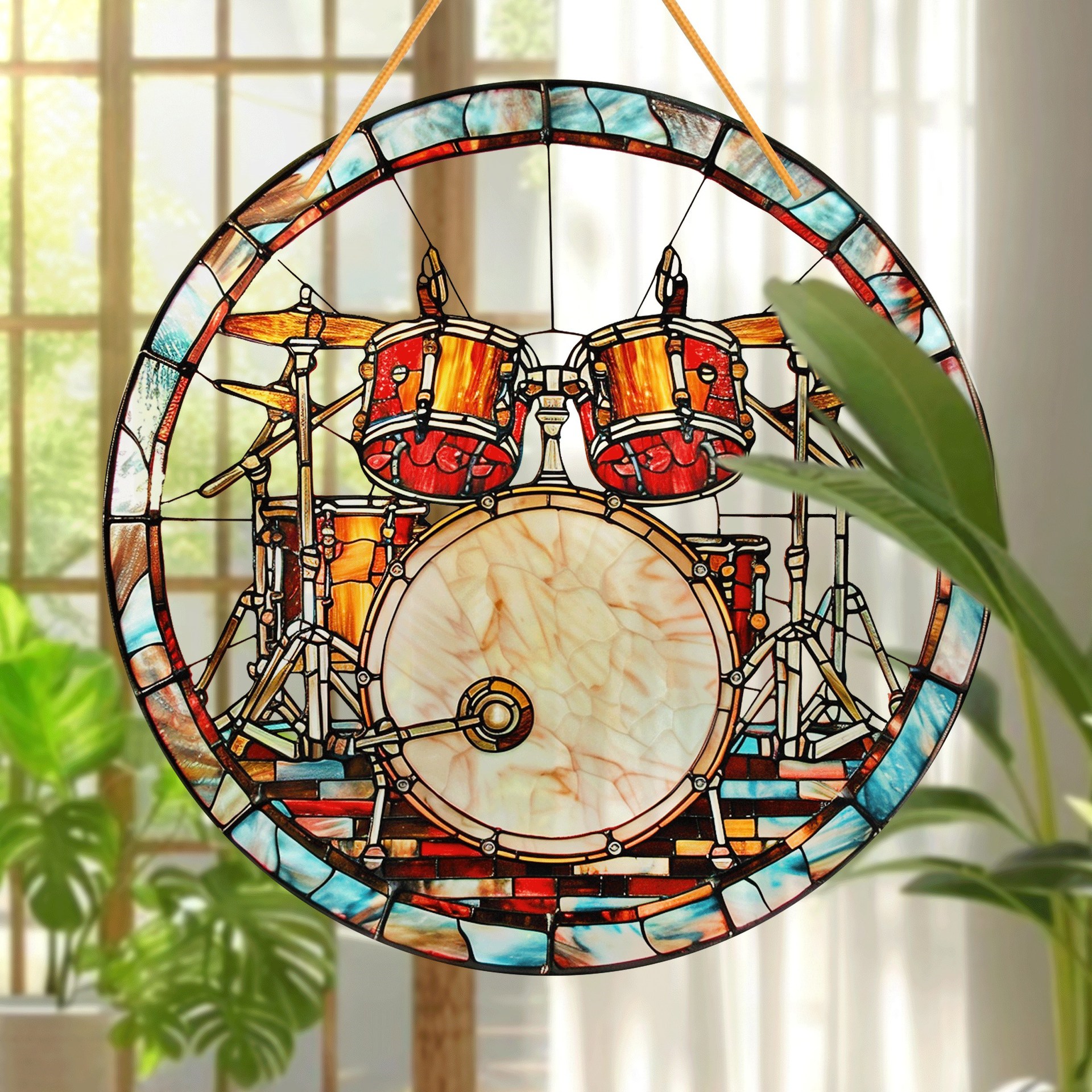 1ピース元気なドラムセットステンドグラスキャッチャー (8 ''' x 8 '')-カラーアクリル音楽