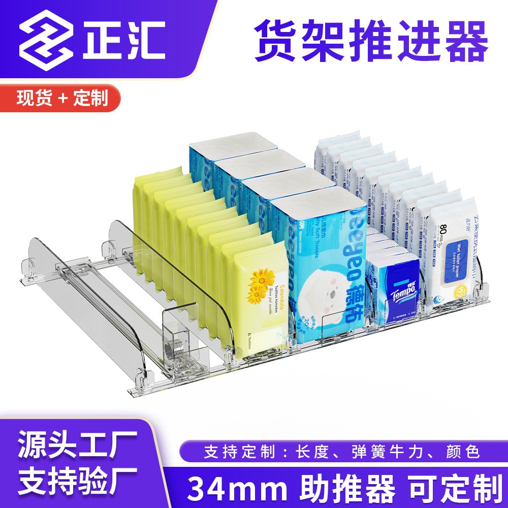 34mmスーパーマーケット棚用プッシャー、透明商品・食品・ポテトチップス用ブースター、業務用アクリル補充プッシャー