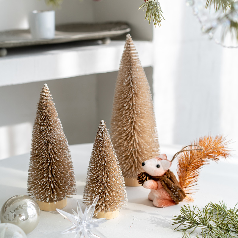メーカー卸売りクリスマス装飾ミニクリスマスツリーのテーブルの雰囲気はシャンパン色の銀色の植毛木を飾る
