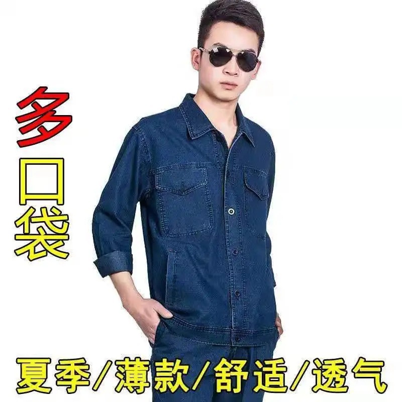 夏の純綿の薄いタイプのデニムの長さ/半袖の作業服のスーツの男性の上着/ズボンの労働保険服の電気溶接の作業服