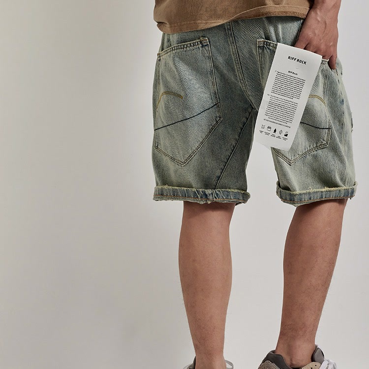 明るい穴の開いたデニムの半ズボンの男性の夏の復古の水洗い