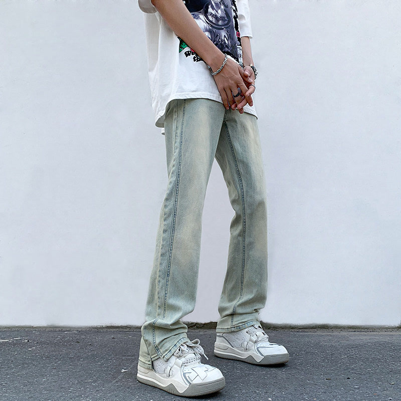 アメリカのレトロな春の男性の水洗いの大きい足のジーパン