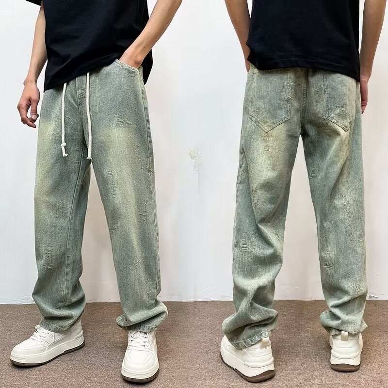 春秋の流行の男性のジーパンの新型のアメリカ式のごろつきのかっこいい揚げ街のまっすぐなズボンの復古の水洗いの広足のハーレムのズボンの潮
