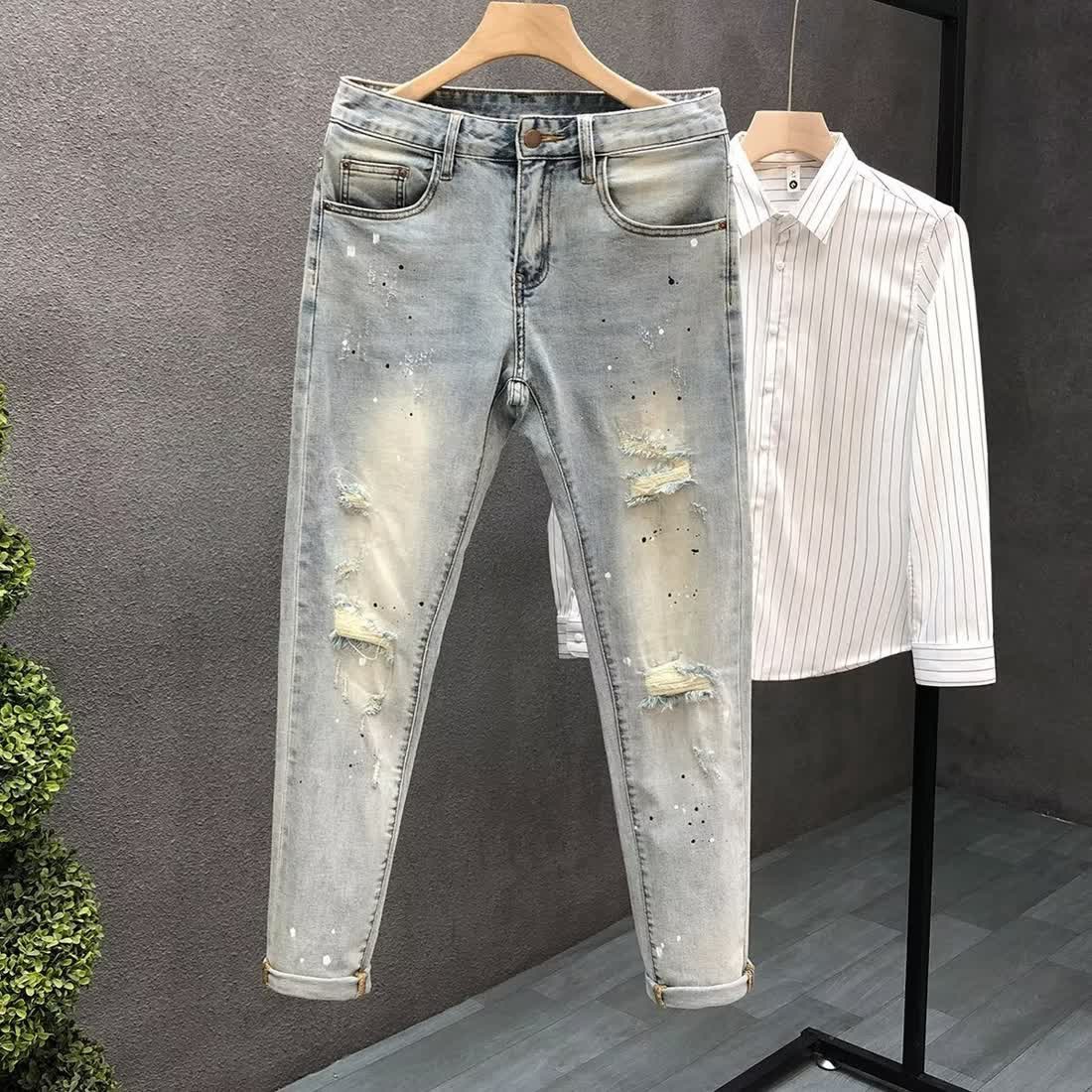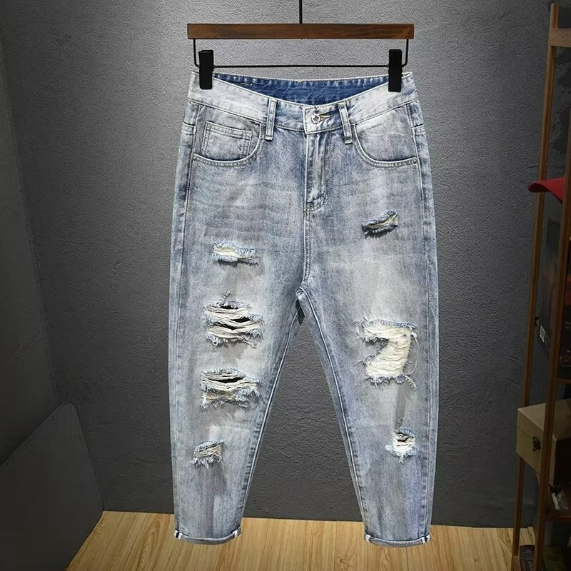 水色の修身ジーパンの男性のファッションブランドの夏の薄いタイプの穴の小さい足のズボンのネットのごろつきの帥の新しいタイプの9分のズボン